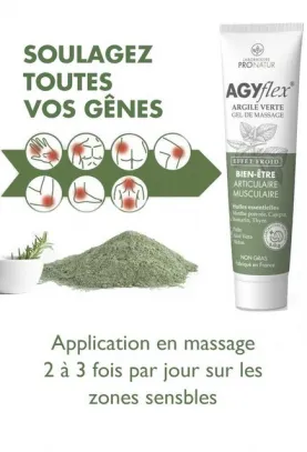 Precio 19,00 €Gel de masaje para el bienestar articular y muscular - AGYflex® GREEN CLAY Gel con 7 plantas incluyendo SODAGYflex® ARGILE VERTE es un gel de masaje analgésico que proporciona un alivio articular y muscular rápido y duradero con efectos...