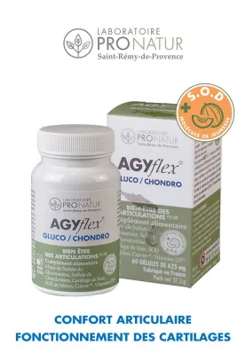 AGYflex® GLUCO / CHONDRO est un complément alimentaire dédié à la régénération des cartilages grâce à ses actifs marins alliés à l’effet renforcé du cuivre, avec de la SOD de melon. La synergie de ses ingrédients naturels stimule la formation du collagène. Sa formule à la glucosamine et chondroïtine assure la souplesse et la résistance des articulations au cours du vieillissement.