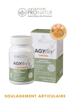 AGYflex® CURCUMA est un complément alimentaire dédié au bien-être articulaire et au soulagement musculaire. Sa formule se fonde sur une synergie avec le poivre noir (la pipérine augmente l’absorption de la curcumine) et la SOD de melon.