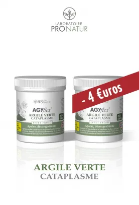Precio 32,00 € Precio base 36,00 €Lote de 2 - Cataplasma de crioarcilla para aliviar músculos y articulaciones - AGYflex® ARCILLA VERDEBIENESTAR ARTICULAR Y MUSCULAR Cataplasma calmante con arcilla verde, vid roja, árnica y mentol. Aplicar en capa fina o en cataplasma...
