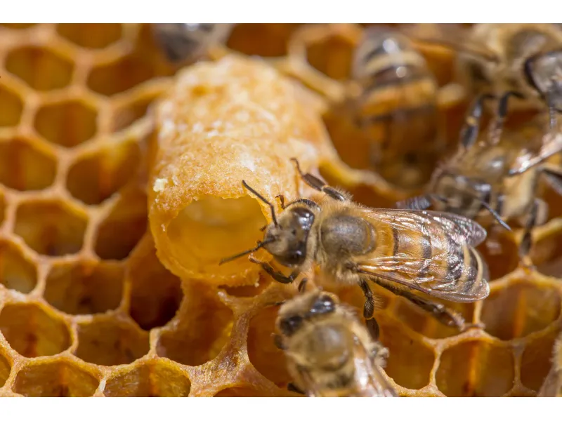 La Reine se nourrit exclusivement de gelée royale et vit 40 fois plus longtemps qu’une abeille ouvrière.
