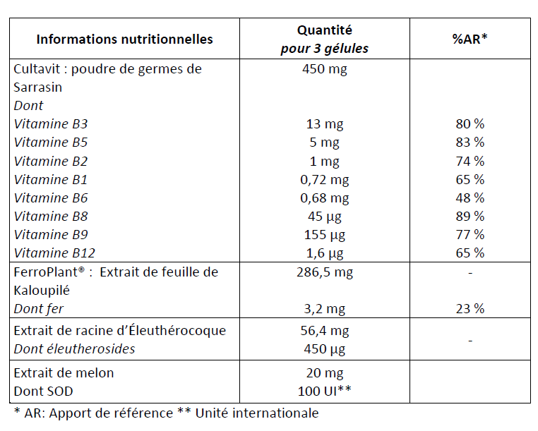 Cultavit® : farine de germes de Sarrasin (Fagopyrum esculentum) titrée en vitamines B, FerroPlant® : extrait de feuille de Kaloupilé (Murraya koenigii) titré en fer, hydroxypropylmethylcellulose (enveloppe de la gélule d'origines végétales), agent de charge : cellulose microcristalline, extrait de racine d’éleutherocoque (Eleutherococus senticosus) titré en éleutherosides, extrait de melon (Cucumis melo) titré en superoxyde dismutase, antiagglomérant : sels de magnésium d’acides gras. Peut contenir du lupin.